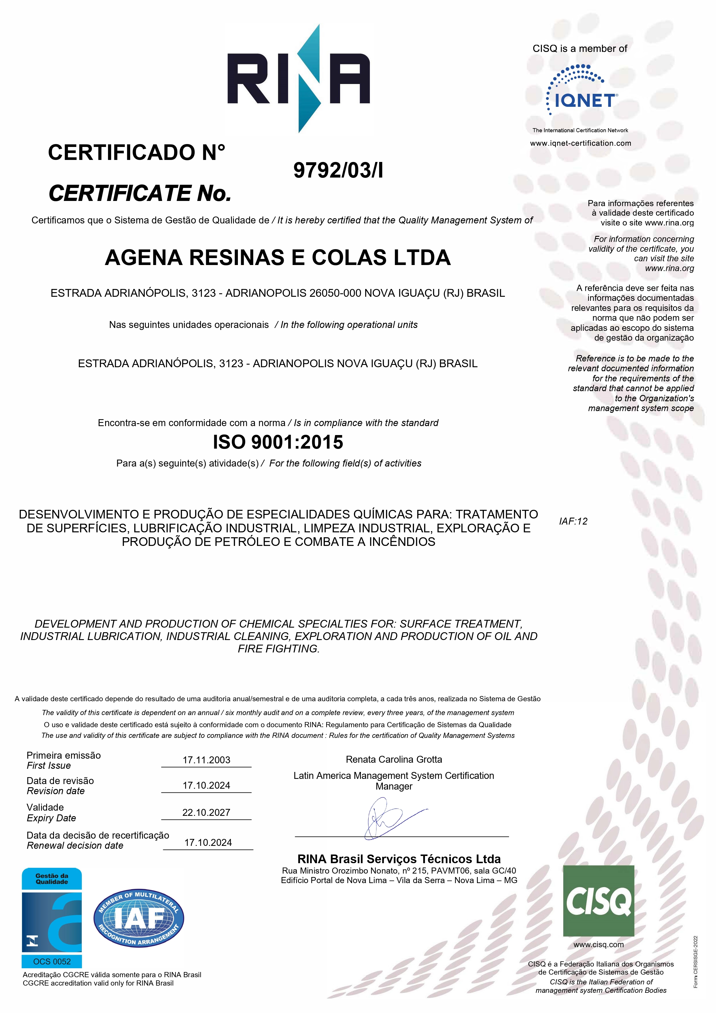 Certificada desde o ano 2000, a agena busca as melhores práticas de mercado visando o aperfeiçoamento contínuo de processos, produtos e serviços.